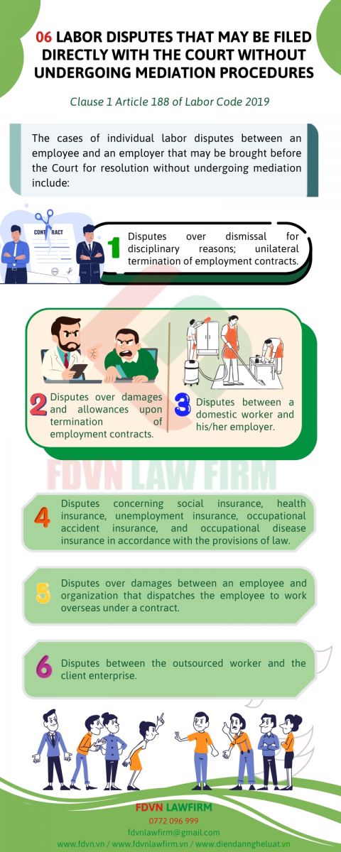 INFOGRAPHIC 06 TRANH CHẤP LAO ĐỘNG ĐƯỢC KIỆN THẲNG RA TÒA ÁN MÀ KHÔNG PHẢI THÔNG QUA THỦ TỤC HÒA GIẢI / INFOGRAPHIC 06 LABOR DISPUTES THAT MAY BE FILED DIRECTLY WITH THE COURT WITHOUT UNDERGOING MEDIATION PROCEDURES