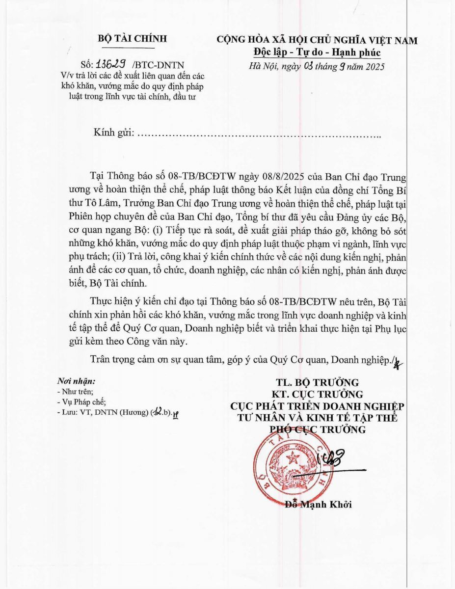 CÔNG VĂN SỐ 13629/BTC-DNTN CỦA BỘ TÀI CHÍNH VỀ VIỆC TRẢ LỜI CÁC ĐỀ XUẤT LIÊN QUAN ĐẾN CÁC KHÓ KHĂN, VƯỚNG MẮC DO QUY ĐỊNH PHÁP LUẬT TRONG LĨNH VỰC TÀI CHÍNH, ĐẦU TƯ
