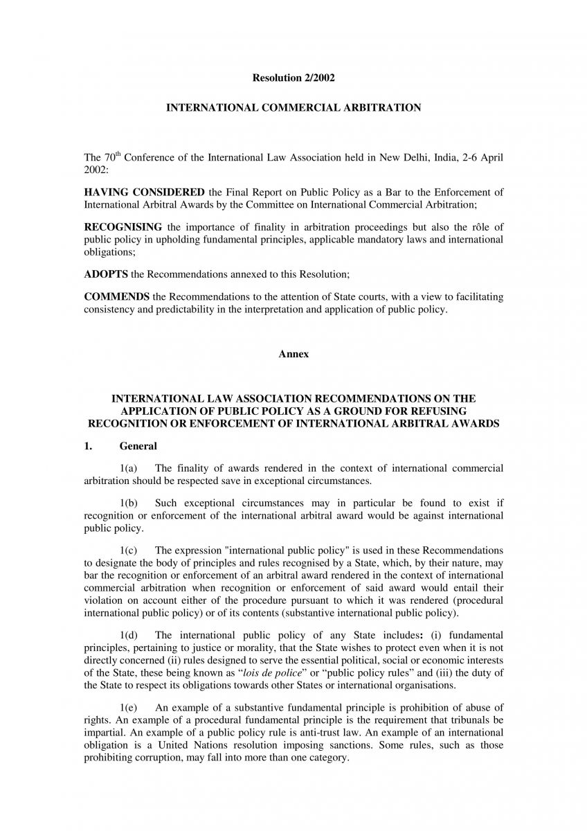 HAVING CONSIDERED the Final Report on Public Policy as a Bar to the Enforcement of International Arbitral Awards by the Committee on International Commercial Arbitration;