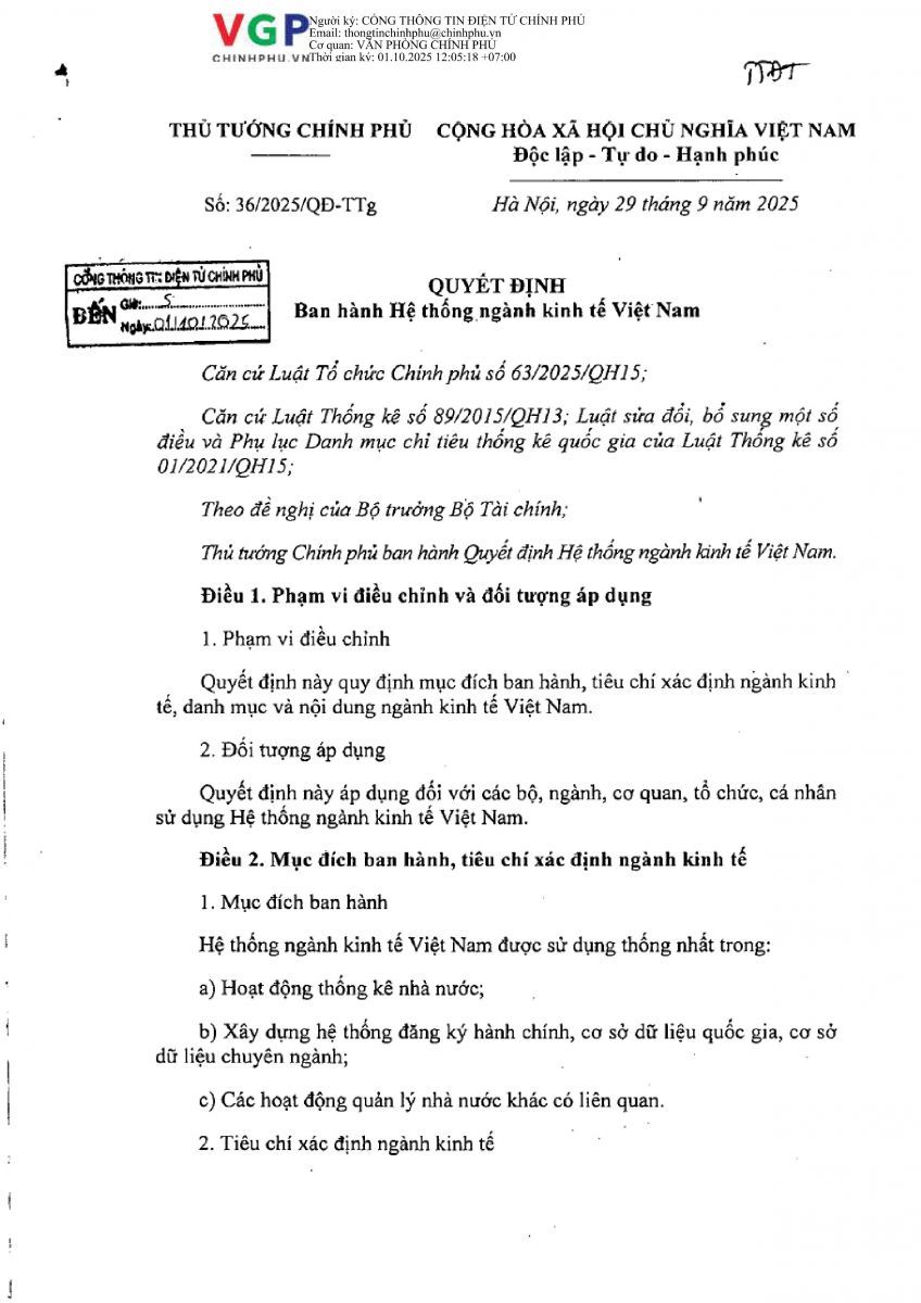 Link of PDF: QUYẾT ĐỊNH SỐ 36/2025/QĐ-TTg BAN HÀNG HỆ THỐNG NGÀNH KINH TẾ VIỆT NAM