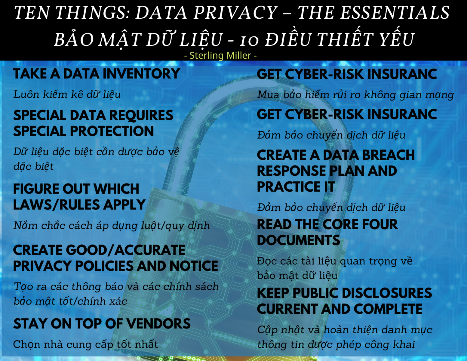 As in-house counsel, you have probably been asked the following question by a panicked (or at least pretty stressed-out) CEO or CFO: “What are we doing about data privacy? Are we okay?” You likely have a good answer, or at least the start of one. Still, your answer may be as open-ended as the question and you can feel overwhelmed by the sheer amount of information on the topic. I know that you want to read another article about data privacy about as much as you’d like to have a safe dropped on your head. But, don’t stop reading. This will not be an overly-detailed discussion about all of the nuances of the issue or a list of regulations and laws of multiple countries (though those discussions are valuable). This edition of “Ten Things” will set out the essential things you need to know about data privacy — key points that you can focus on as you work through or oversee data issues for your company.