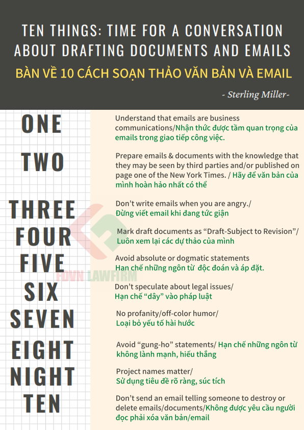 Below are ten things you can use in your daily dealings and conversations with the business to help limit problems that can arise from poorly prepared documents. I have included some links to other resources as well. A lot is focused on emails, but the rules apply to pretty much any written communication (including instant messages and recorded voicemails). Feel free to cut and paste these into your own check-list or email (or however you best can get the word out at your company).