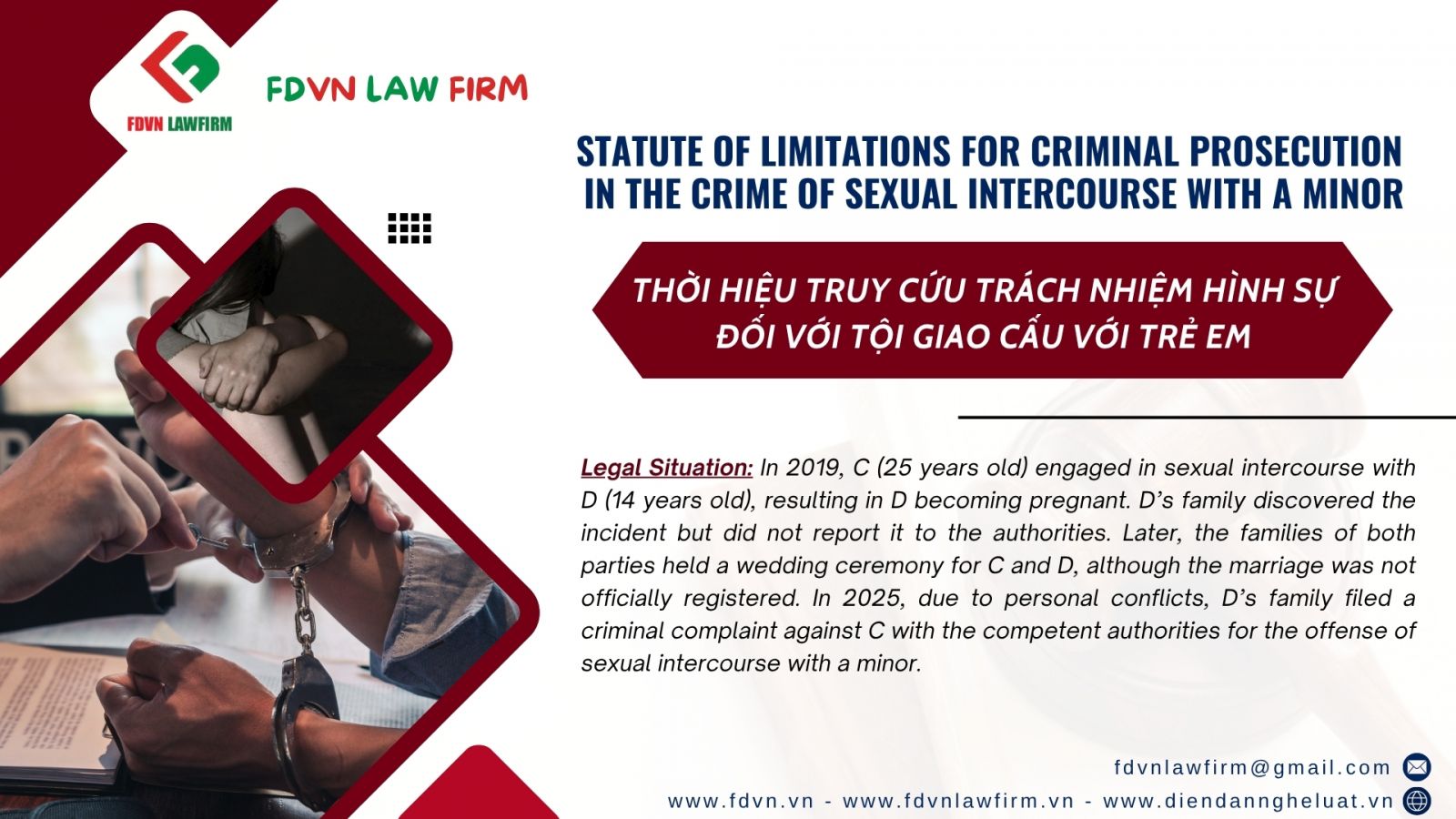 Accordingly, in the case under consultation, C and D voluntarily engaged in sexual intercourse in 2019. By 2025, a period of six (06) years has elapsed since the commission of the act. Therefore, if the act is discovered and there are sufficient grounds to establish the constituent elements of the crime, criminal prosecution may still be initiated, as the case remains within the 15-year statute of limitations.